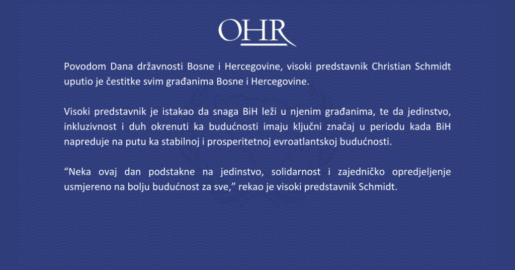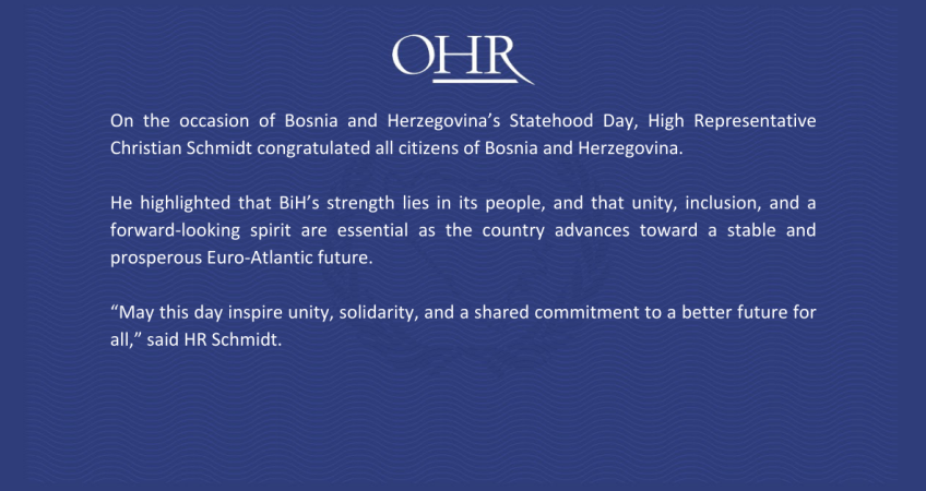 Povodom Dana državnosti Bosne i Hercegovine, visoki predstavnik Christian Schmidt uputio je čestitke svim građanima Bosne i Hercegovine.